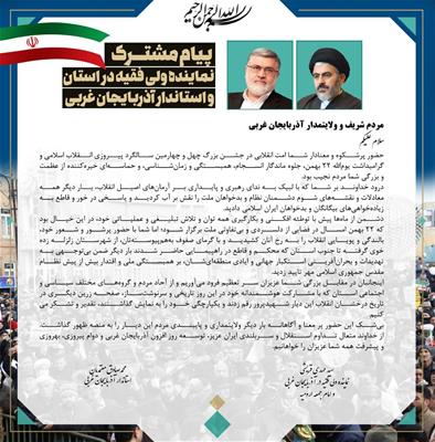 پیام مشترک نماینده ولی فقیه در استان و استاندار آذربایجان غربی به مناسبت حضور پرشور مردم در راهپیمایی روز 22 بهمن