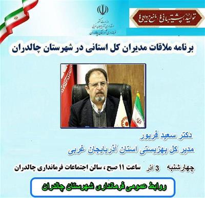 ملاقات مردمی مدیرکل بهزیستی استان آذربایجان غربی در شهرستان چالدران راس ساعت ۱۱ صبح روز چهارشنبه مورخ۱۴۰۰/۰۹/۰۳ در سالن جلسات فرمانداری شهرستان چالدران برگزار خواهد شد، لذا شهروندان محترم می توانند با حضور در فرمانداری مسائل و مشکلات خود در این حوزه را مطرح نماین